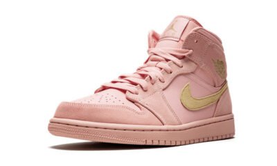 The Air Jordans 1 Mid “Coral Stardust” is a special edition of the classic mid-top Jordans 1. This premium colorway features a unique and striking look in a Coral Stardust shade of pink across the leather and suede upper, laces, and rubber sole unit. The predominantly tonal treatment is broken up by Club Gold for the side Swooshes, Air Jordans “wings” logos on the heels, and Jumpman logos on the tongue patches. The Air Jordans 1 Mid “Coral Stardust” released during the summer of 2019.