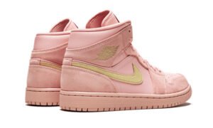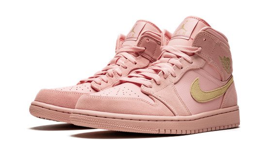 The Air Jordans 1 Mid “Coral Stardust” is a special edition of the classic mid-top Jordans 1. This premium colorway features a unique and striking look in a Coral Stardust shade of pink across the leather and suede upper, laces, and rubber sole unit. The predominantly tonal treatment is broken up by Club Gold for the side Swooshes, Air Jordans “wings” logos on the heels, and Jumpman logos on the tongue patches. The Air Jordans 1 Mid “Coral Stardust” released during the summer of 2019.